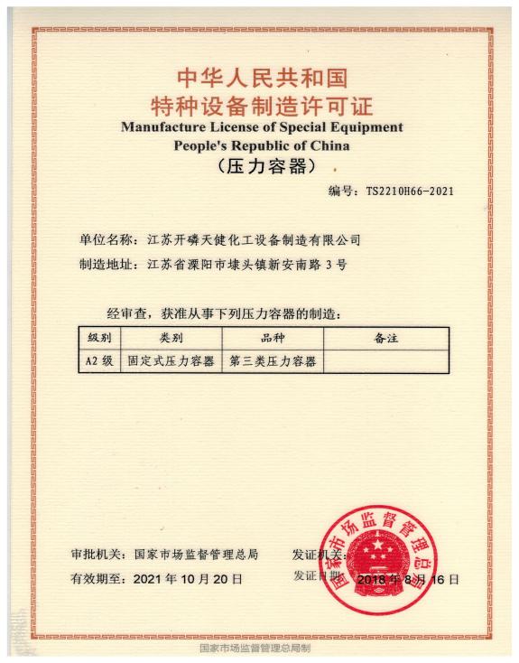 8月28日,天建公司收到由国家市场监督管理总局颁发的编号为:TS2210H66-2021,有效期至2021年10月20日的A2级压力容器制造许可证,获准从事A2级固定式压力容器第三类压力容器的制造,标志着天健公司四年一次的压力容器证复审换证工作圆满完成。